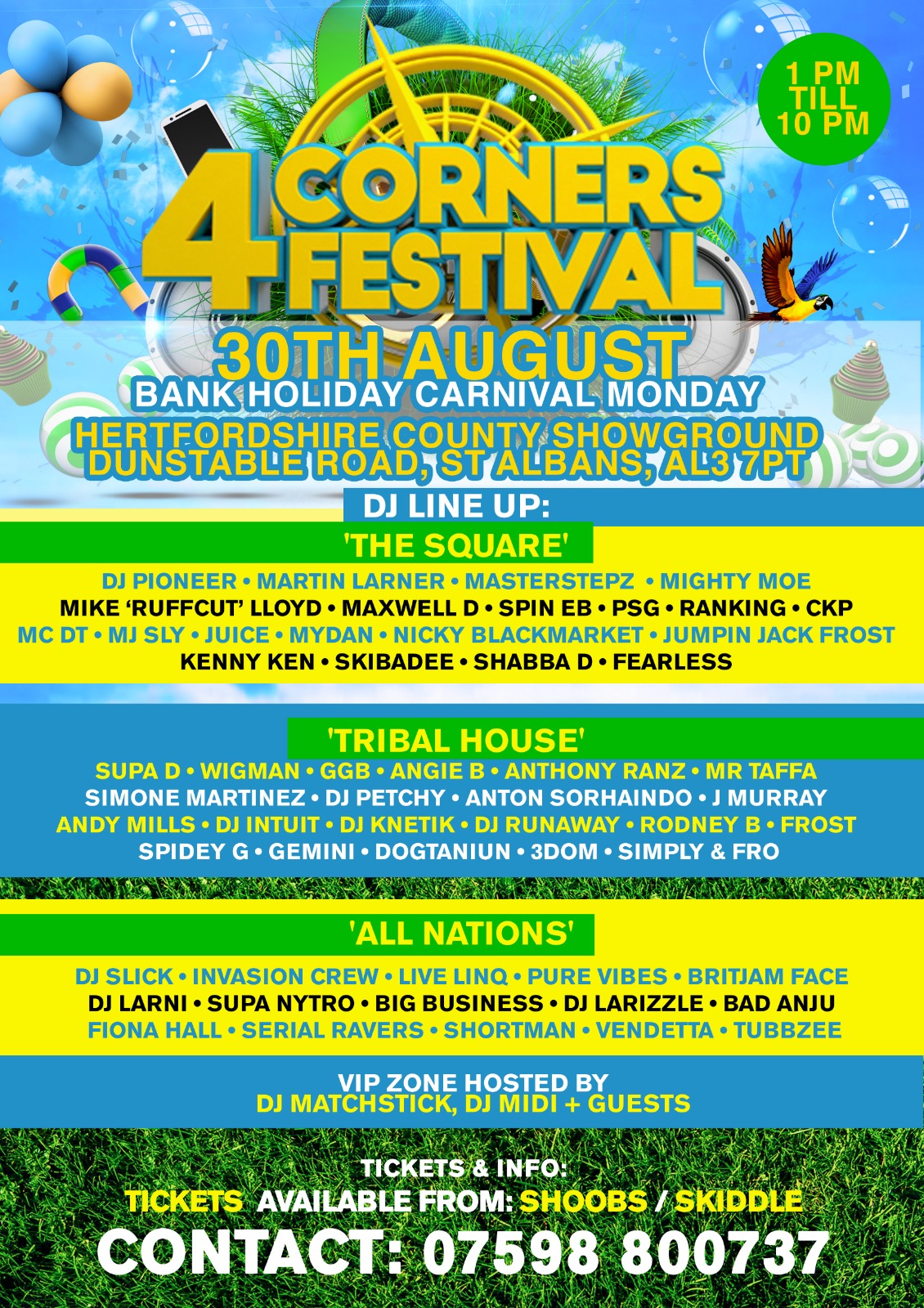 4CORNERS FESTIVAL Bank Holiday Mon 30th August @ HERTFORDSHIRE COUNTY SHOWGROUND 1-10pm Creating that Carnival vibe with 3 arenas of musical bliss + V.I.P Area on an all purpose festival site!...